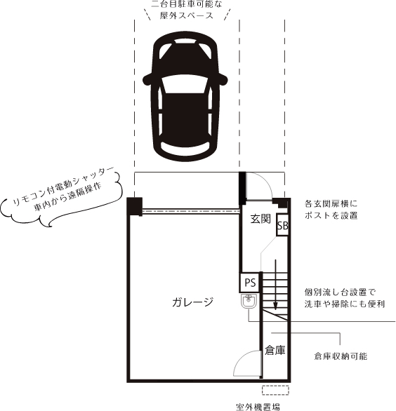 | ガレージ設備 | 電動シャッター/車庫内照明/換気扇/個別流し台(スロップシンク)/有孔ボード/大型車可/EV・PHEV(電気自動車)充電用コンセント |