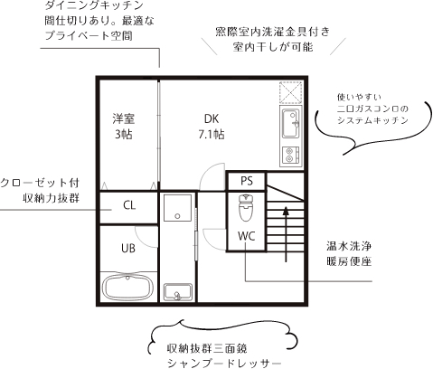 | 居住設備 | 3点セパレート(浴室、トイレ、洗面台)/室内洗濯パン/独立洗面台(シャンプードレッサー)/浴室(1216)/クロゼット/トイレ温水洗浄暖房便座付/室内洗濯物干し金具/エアコン/二面採光/電話回線引き込み可/インターネット接続 |