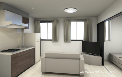 約7帖ほどあるダイニングキッチンは広々とした快適な居住空間となり、壁付けキッチンを採用することでその他のスペースを広く確保頂けます。洋室とダイニングキッチンには間仕切りが施され、来客の際でもプライベートエリアを確保することが可能です。